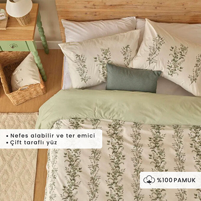 Tweepersoons Julia dekbedovertrekset in groen, gemaakt van 100% katoen ranforce 57 draad. Dankzij de hoge vochtabsorptie van de 100% natuurlijke katoendraad blijft het ademend en voorkomt het transpiratie. Gemaakt in Turkije, met OEKO-TEX en BSCI certificering. Bevat geen kankerverwekkende of allergene metalen, irriteert de huid niet en is veilig voor de gezondheid. Er worden geen azo-kleurstoffen gebruikt die schadelijk kunnen zijn voor de gezondheid. Kan gewassen worden op 30°C, centrifugeren op lage snelheid, drogen in de droger op lage temperatuur, strijken op lage temperatuur, wassen met vergelijkbare kleuren en geen bleekmiddel gebruiken.
