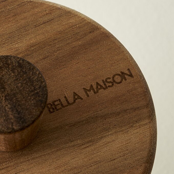 Een stijlvolle pot met een houten deksel, gemaakt van acaciahout en borosilicaatglas met strepen. De diameter van de pot is 9 cm en de hoogte is 18,1 cm. Het glazen gedeelte van de pot is vaatwasserbestendig. Voor langdurig gebruik wordt aangeraden het houten deksel met de hand te wassen.