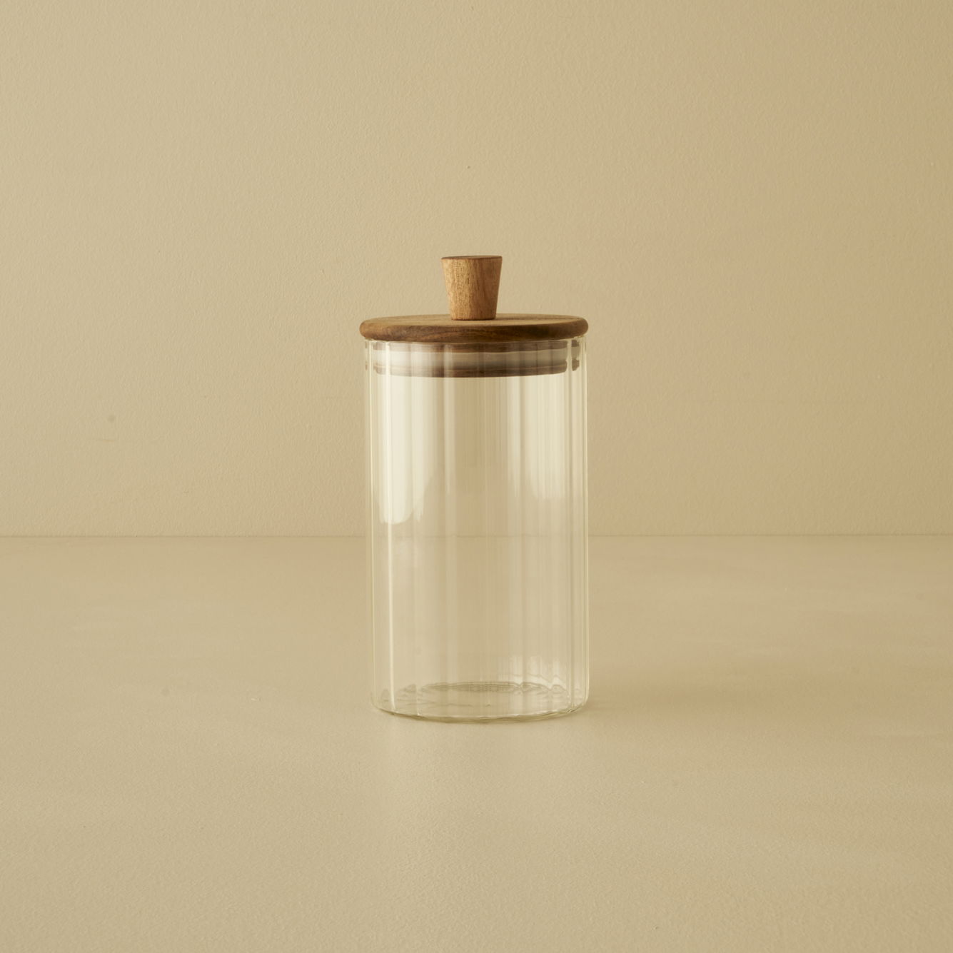 Deze stijlvolle pot is gemaakt van gestreept borosilicaatglas en acaciahout en heeft een houten deksel. Deze pot heeft een diameter van 9 cm en een hoogte van 15,1 cm. Dankzij zijn slanke en elegante vorm is hij ideaal voor het bewaren van verschillende producten, zoals kruiden, snoep, koffiebonen of andere kleine voorwerpen. De afmetingen zorgen voor een mooie balans tussen compactheid en inhoud, waardoor de pot zowel praktisch als esthetisch aantrekkelijk is.