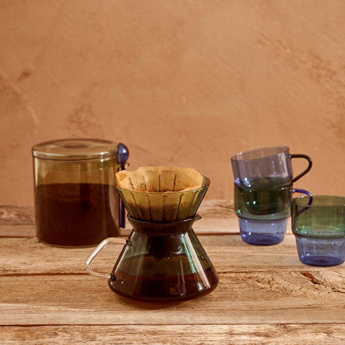 Deze groene, hittebestendige theepotset van borosilicaatglas bestaat uit een karaf en een filter. Deze handgemaakte set is mondgeblazen. Een koffiefilterpapiertje wordt bovenop de theepot geplaatst. Heet water wordt voorzichtig over de theepot gegoten om deze te bevochtigen. Gemalen koffie wordt vervolgens op het natte papier gegoten. Het hete water wordt vervolgens langzaam over de koffie gegoten. Uw filterkoffie stroomt geleidelijk naar de bodem van de theepot, klaar om te drinken.
