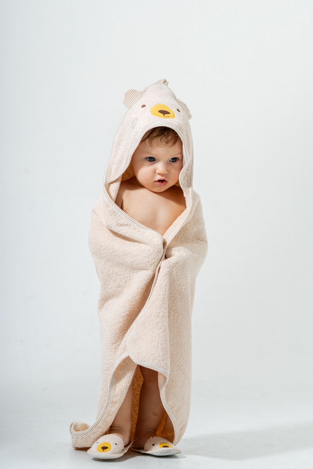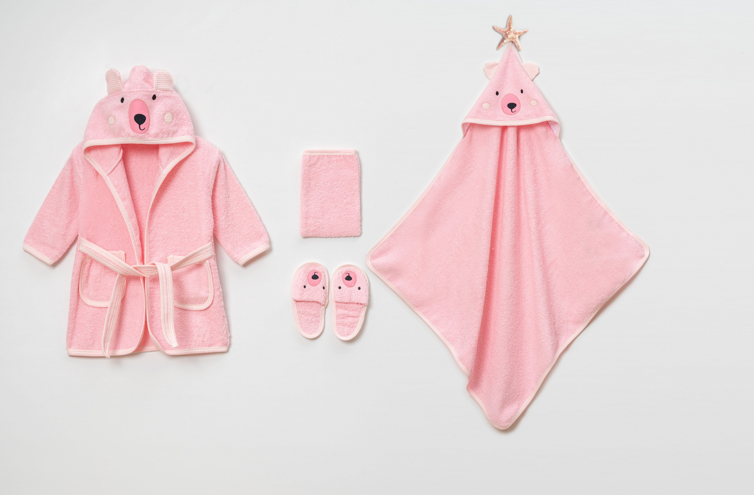 De set bestaat uit een comfortabele badjas, een badcape met capuchon, bijpassende slofjes en een washandje. Het gebruik van 100% katoen zorgt voor optimale zachtheid, goede absorptie en draagcomfort.