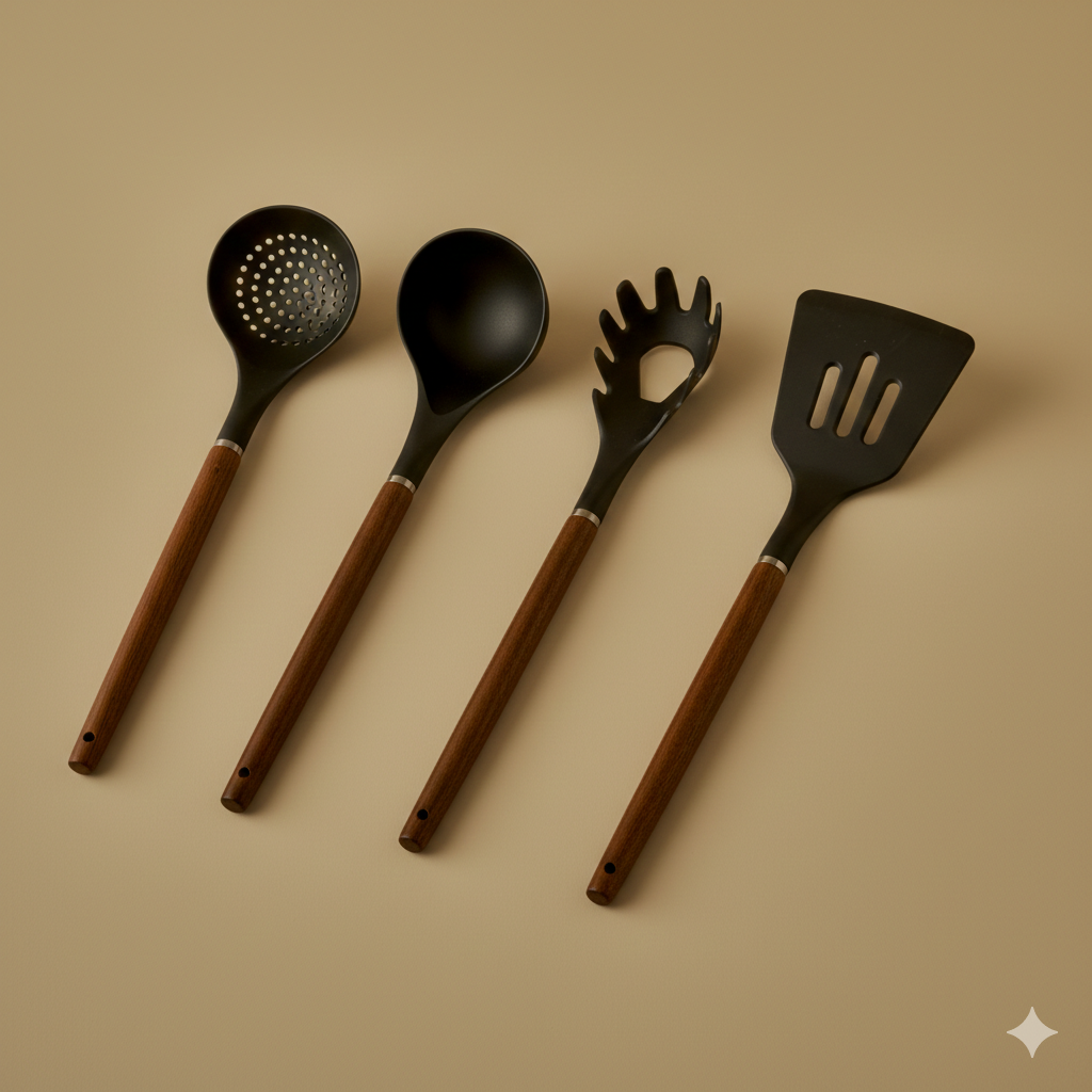 Upgrade je keuken met deze stijlvolle en praktische set keukenhulpen. De perfecte combinatie van een modern design en hoogwaardige materialen. De koppen zijn gemaakt van hittebestendig, voedselveilig silicone (ideaal voor pannen met een anti-aanbaklaag), gecombineerd met ergonomische houten handgrepen voor een natuurlijke look en comfortabele grip.