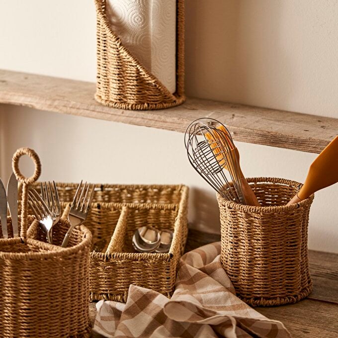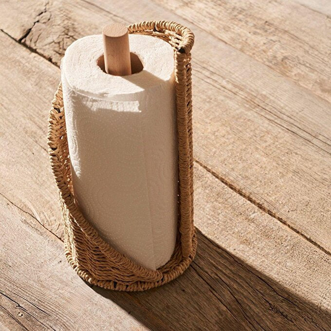 Keukenrolhouder van 27x14 cm, gemaakt van papieren touw dat is gevlochten over een zwart metalen frame.