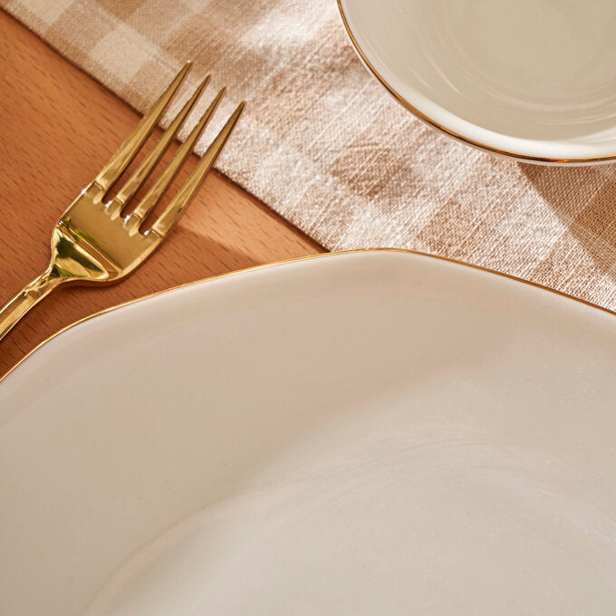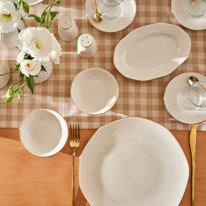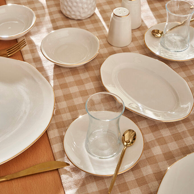 Deze Opal porseleinen 6-persoons ontbijtset heeft een amorf ontwerp met randen verguld met echt goud. De set is vaatwasserbestendig en geschikt voor gebruik in magnetron en oven. 100% Turks fabricaat.